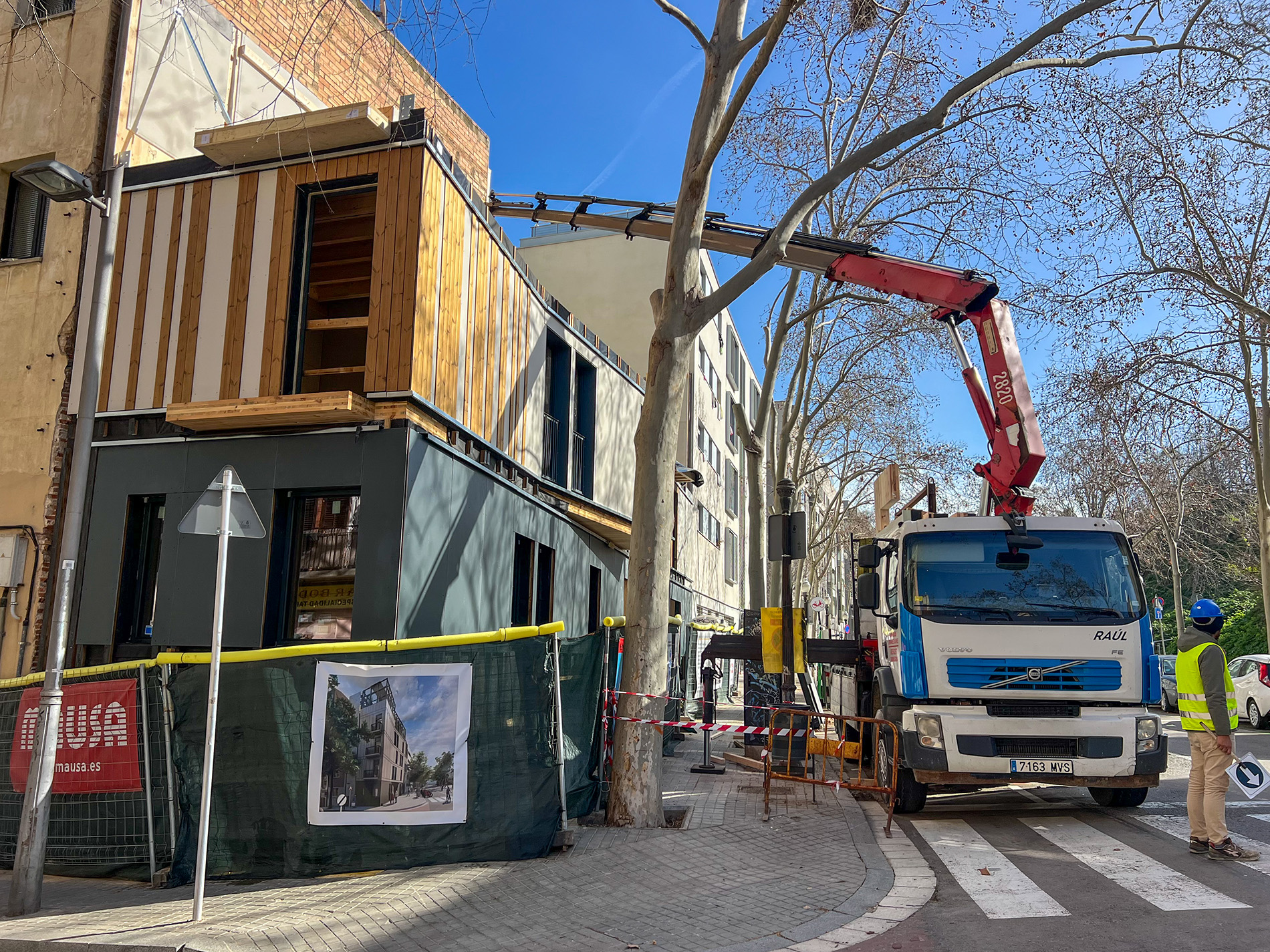 Esta fase de ensamblaje no es solo un hito constructivo, sino la prueba de validación del sistema modular de madera que impulsamos. La velocidad de ejecución —a pesar de las inclemencias del tiempo— pone de manifiesto las ventajas de una construcción industrializada y descarbonizada, capaz de reducir drásticamente los plazos y las molestias al vecindario en comparación con los métodos convencionales.